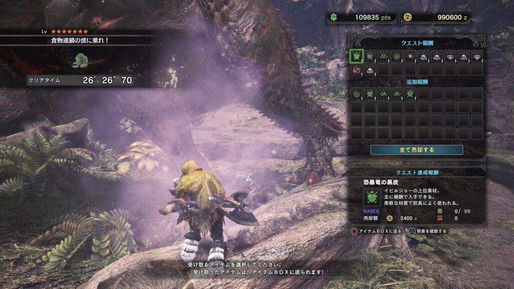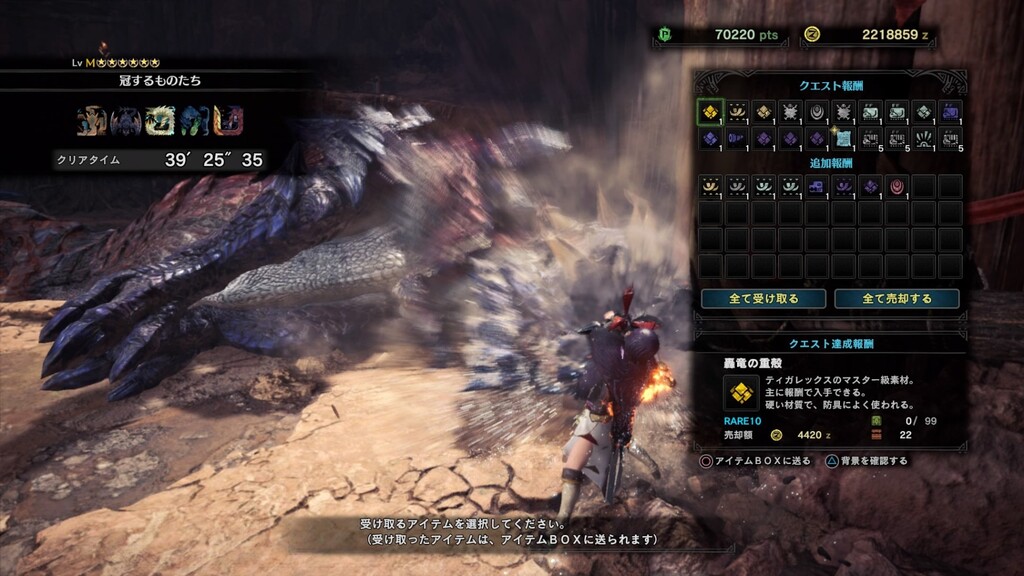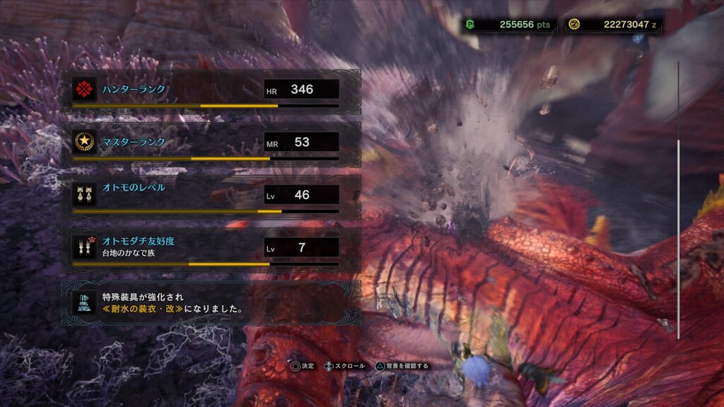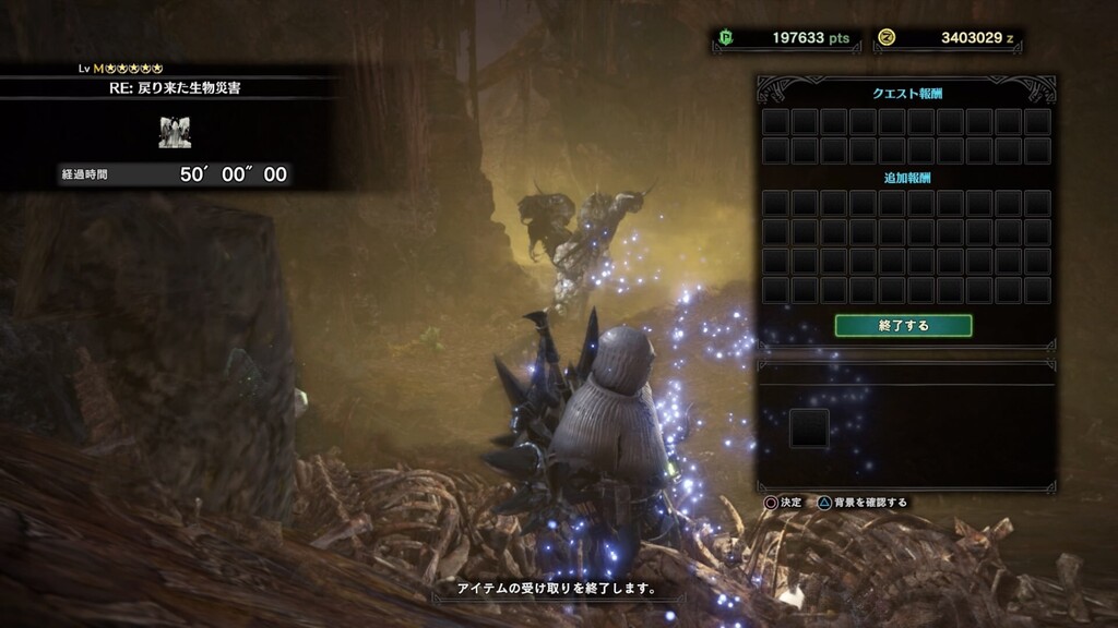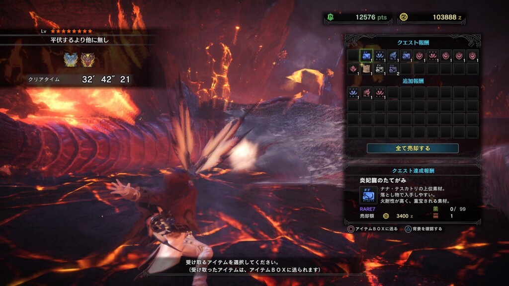 10種モンスターの研究レベルをMAXにし、任務クエストのクシャルダオラ討伐。その後武具屋のおばちゃんと話し、フリークエスト「胸をよぎる荒天の予感」をクリア。再度おばちゃんに話しかける